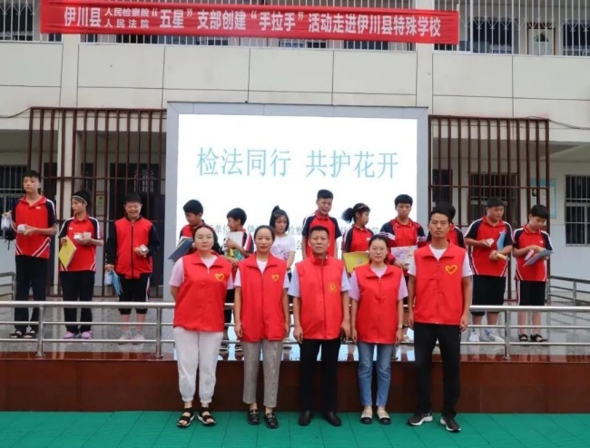 为营造关心儿童健康快乐成长的良好氛围,引导党员干警弘扬志愿服务精神,增强社会责任感使命感,6月17日上午,伊川县人民法院党支部、伊川县人民检察院党支部、伊川县暖田心理室和伊川县社工协会一起走进伊川县特殊教育学校,开展“手拉手”支部共建主题党日活动,为学生们送去爱心礼物。