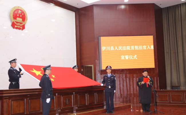 5月4日上午,伊川县人民法院举行首批入额法官宣誓仪式,33名首批入额法官在国徽和国旗下庄严宣誓。县人大常委会副主任韩灿秋、郭孟现,县政协副主席郭遂彬等领导出席宣誓仪式。